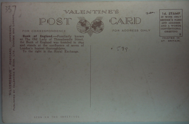 ITEM DESCRIPTION: You are bidding on a Postcard of : Bank of England & Royal Exchange, Valentine's Series 'Silveresque' postcard. Some marks to the postcard so please see images.
